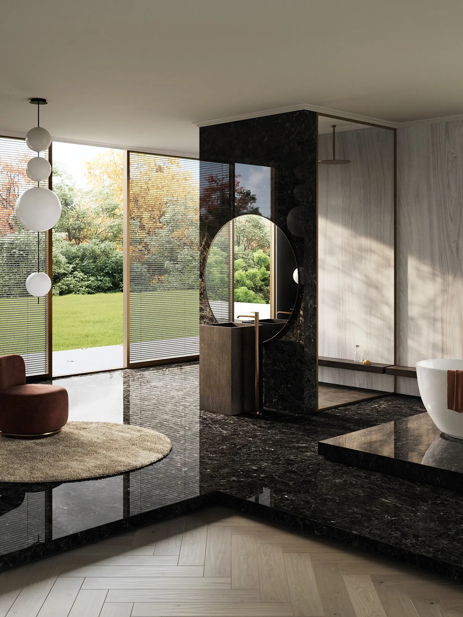 Large format porcelain tiles.Originating from the most ancient Greece, this marble materializes on a canvas that gives personality to spaces. Its veining creates striking contrasts to give shape to exuberant and exotic compositions.