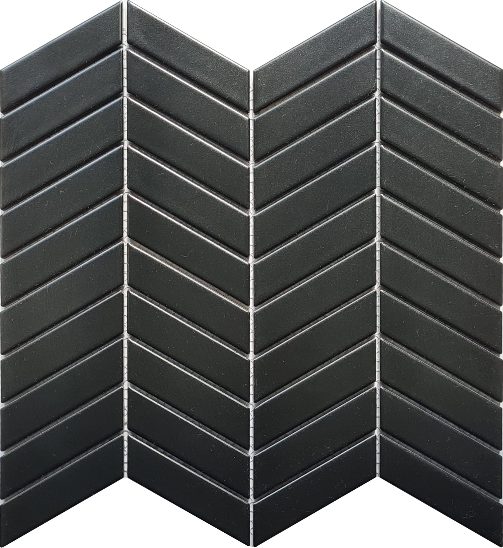 Black ceramic /porcelain mosaic, matt finish. Suitable for wall & wet areas. Piece size: 23x85x5mm Sheets per m2: 11