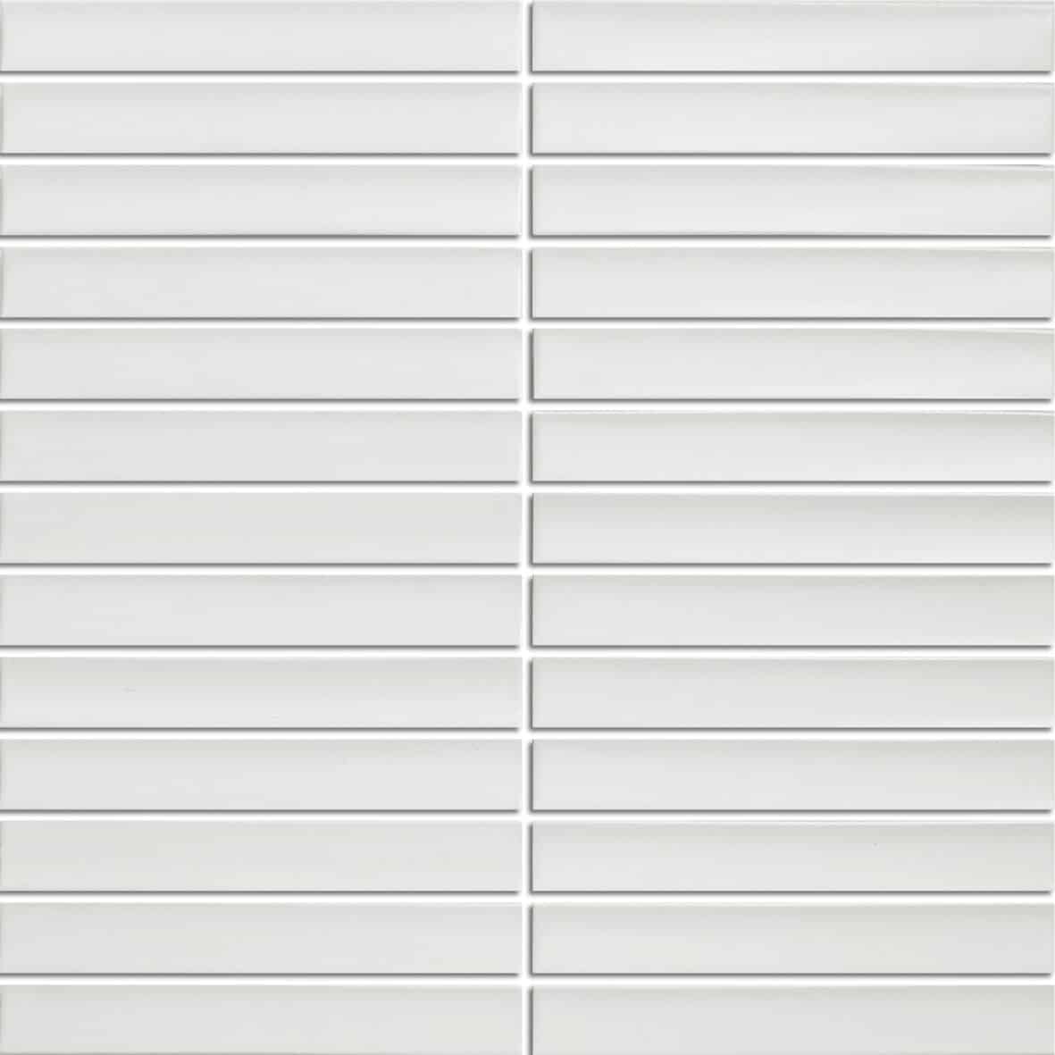 White matt Autumn Fairy ceramic kitkat, suitable for walls and wet walls. Piece size: 20x145x8mm Sheets per m2: 11