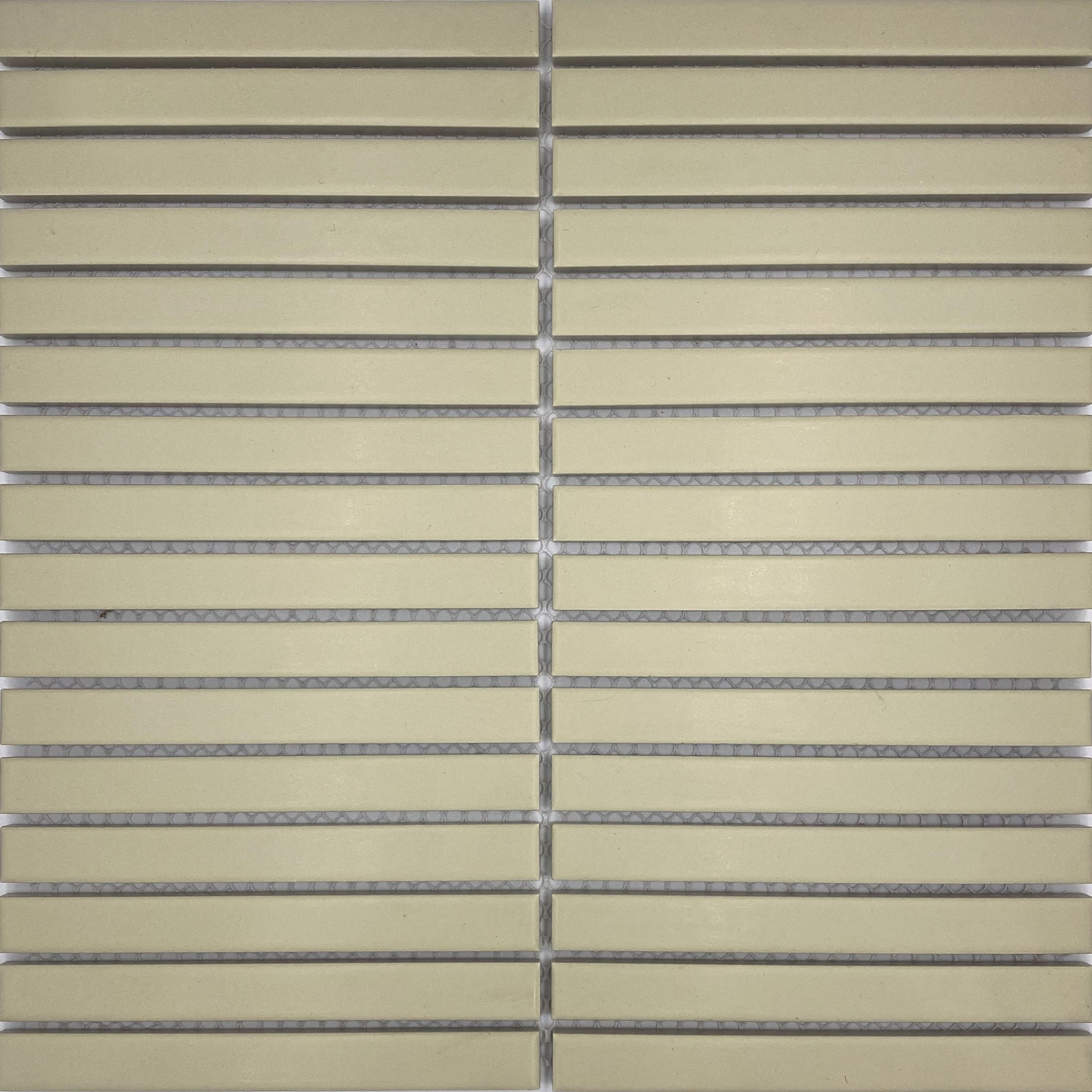 Khaki kitkat, ceramic/porcelain mosaic. suitable for walls, wet walls and internal areas. Piece Size: 15x145x6mm SHEETS PER M2 : 11