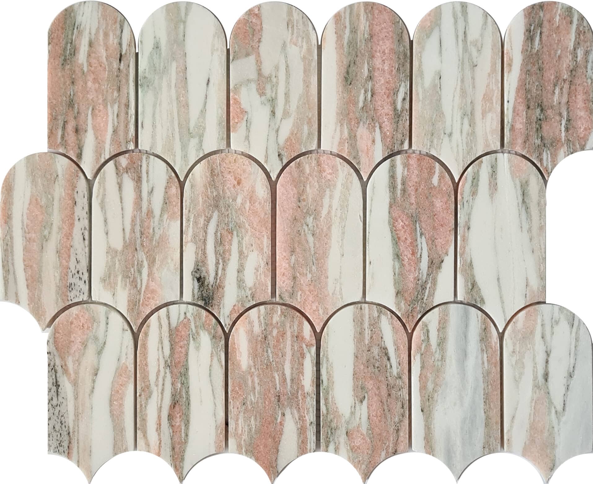 Grey, Light Grey, Pink, Gloss finish,Natural Stone ceramic mosaic .Suitable for wall, low foot traffic & wet walls. Piece size: 12.5 Sheets per m2
