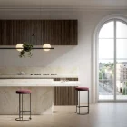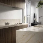 Large format porcelain tiles. Finesse, elegance and luminosity. Taj Mahal interprets the fine natural quartzite in a design with a classic-renewed aesthetics. The succession of fluid beige layers and the slight movement of its gold and taupe veins summarise the beauty of a material that enhances spaces.