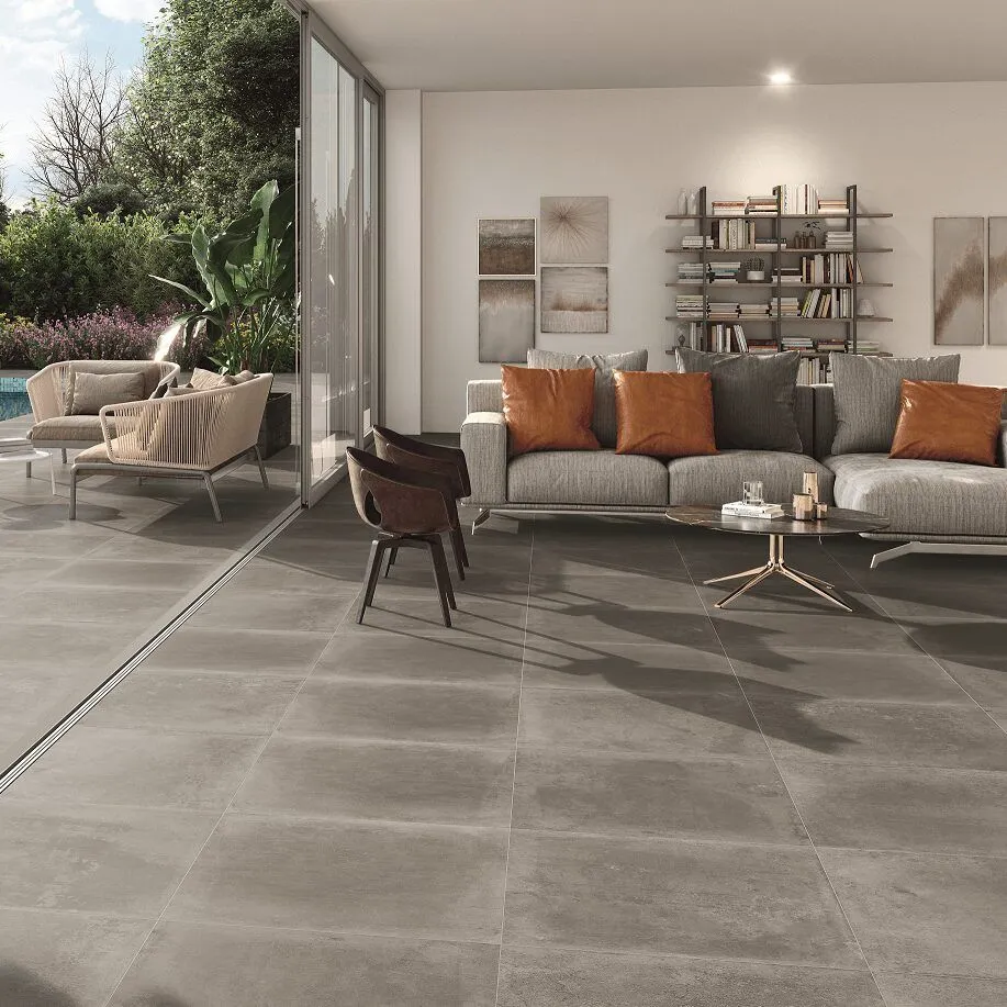 Gris Matt rectified porcelain tile, cement look, R9 & matt finish. PEI 3, glazed, full body, 8 faces. Suitable for indoor floor surfaces.