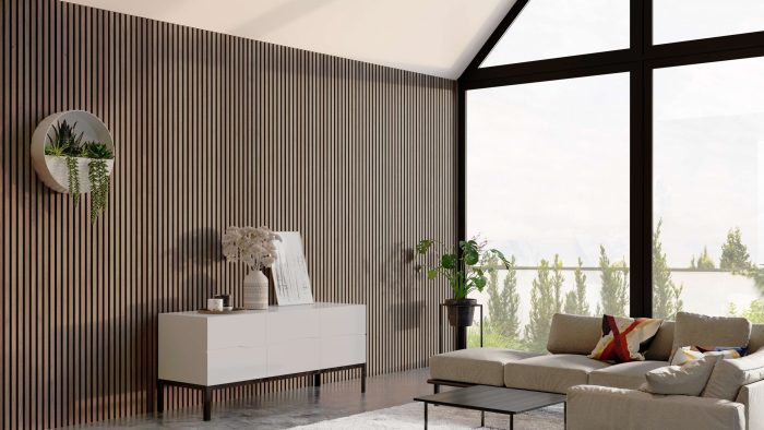 Classic Oak wooden panels with black felt backing can be used for creating beautiful slat walls and ceilings which adds a modern look to the room. The panel is sound dampening and removes reverberation within the room, which drastically improves the acoustics within the room.